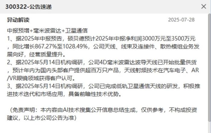 厚积薄发。虽然硕贝德勇创新高的28日,其所属数个概念板块整体呈现涨势,出现多股涨停局面,但当天盘中,券商行情软件给出异动解读,显示三点中期利好赋能股价突破:第一,公司2025年中报预告净利润3000万元至3500万元,同比增长867.27%至1028.49%。第二,据2025年5月14日机构调研,公司4D毫米波雷达波导天线已开始批量供货,预计年内为国内头部客户提供超百万只产品,天线射频技术在汽车电子、AR/VR眼镜领域获得客户认可。第三,据同期机构调研,公司已完成低轨卫星通信天线的研发,积极推进技术迭代和市场应用,具备前瞻性技术优势。