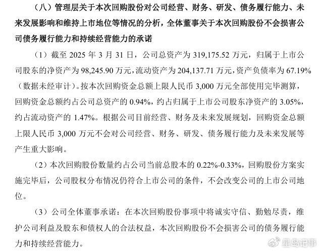 公告显示,截至2025 年3月31日,公司总资产为319,175.52万元,归属于上市公司股东的净资产为98,245.90万元,流动资产为204,137.71万元,资产负债率为67.19%(数据未经审计)。按这次回购资金总额上限3,000万元全部使用完毕测算,回购资金总额约占公司总资产的0.94%,约占归属于上市公司股东净资产的3.05%,约占流动资产的1.47%,回购资金总额上限3,000 万元不会对公司经营、财务、研发、债务履行能力及未来发展等产生重大影响。
