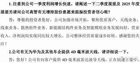 彼时,股东问及如何提振投资者信心,朱坤华表示,通过加强市场开拓,聚焦优质客户,天线业务、线束业务、散热组件业务、新能源结构件业务及智能模组业务发展向好,营业收入、净利润均实现同比较大增长,公司整体经营质量逐步好转;同时,向客户提供的4D毫米波雷达波导天线,正在快速上量中。
