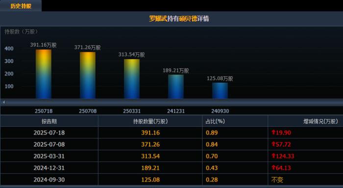 从去年三季度初次现身开始,罗耀武一路坚定加仓,截至今年7月18日的第五次披露,他成为唯一增持硕贝德,且排名逐渐提升至第二名的前十大流通股股东。