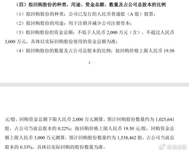 按回购价格上限19.50元/股,回购资金总额下限2,000万元测算,预计回购股份数量约为1,025,641股,占公司当前总股本的0.22%;按回购价格上限19.50元/股,回购资金总额上限3,000万元测算,预计回购股份数量约为1,538,462股,占公司当前总股本的0.33%。