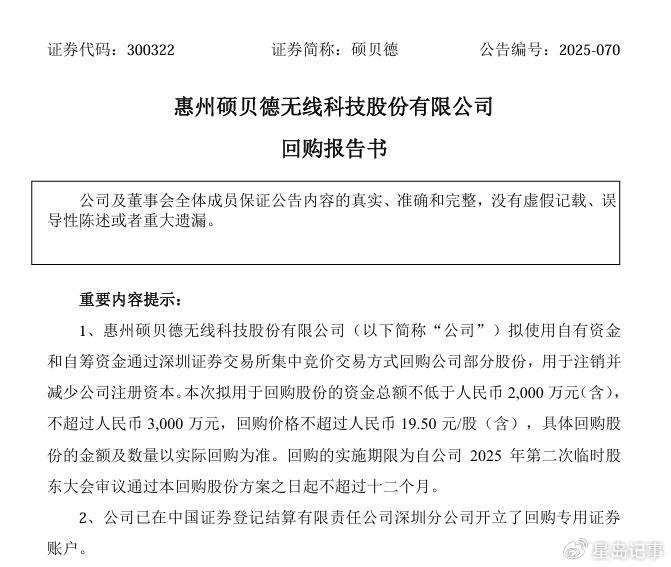 7月25日,硕贝德发布的《回购报告书》显示,公司拟使用自有资金和自筹资金通过深圳证券交易所集中竞价交易方式回购公司部分股份,拟用于回购股份的资金总额不低于人民币2,000万元(含),不超过3,000万元,回购价格不超过19.50元/股(含)。
