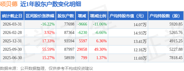 从股价来看,2026年2月28日至2026年3月31日,硕贝德区间跌幅为16.22%,在此期间股东户数减少9666.0户,减幅为11.06%。