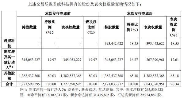 该事项实施完成后,君威科技将持有旋极信息18.55%的股份,陈江涛及其一致行动人持股比例由19.97%降至16.27%,放弃部分股份的表决权后,持有表决权股份占比为12.61%,上市公司实际控制人将由陈江涛变更为绵阳市国资委。