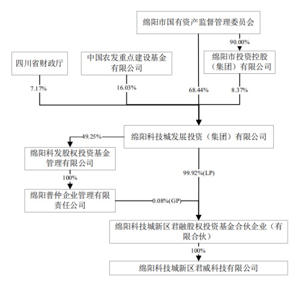 公告显示,君威科技成立于2022年8月9日,其100%控股股东绵阳科技城新区君融股权投资基金合伙企业(有限合伙)(简称“君融基金”)成立于2022年8月5日,仅早了4天;而君融基金的执行事务合伙人绵阳普仲企业管理有限责任公司(简称“绵阳普仲”)成立于2022年7月5日,也仅是早了一个月。