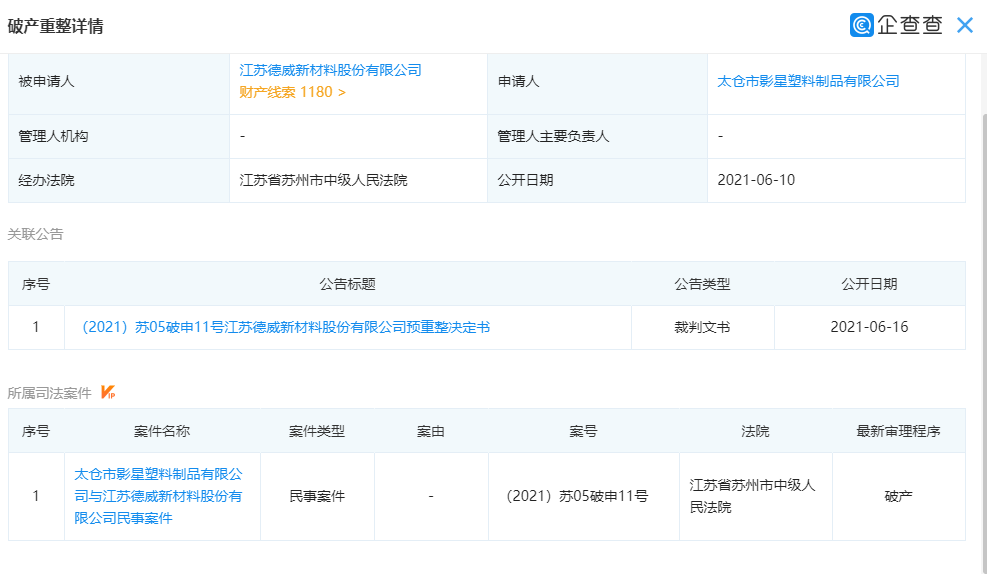 近期德威新材并不好过,8月17日企查查显示江苏德威新材料股份有限公司被苏州市中级人民法院列为被执行人,执行标的为1.05亿元。案号为(2021)苏05执886号,立案日期为2021年8月16日。而其的总被执行金额高达46217.08万元。且该企业有被执行人记录9条、限制高消费记录1条。太仓市影星塑料制品有限公司作为*ST德威的债权人,已于2021年6月向江苏省苏州市中级人民法院申请预重整,案号为(2021)苏05破申11号。