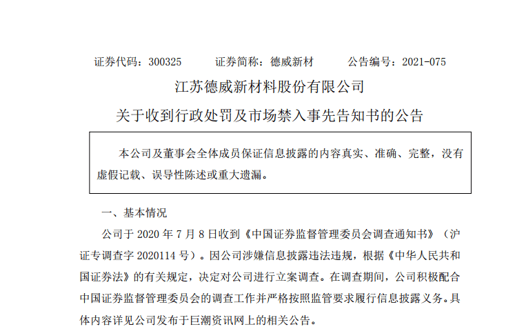ST德威(300325.SZ)9月13日晚间公告,公司于9月12日收到了证监会下发的《行政处罚及市场禁入事先告知书》,证监会认为,德威新材未按规定披露对外担保、重大诉讼信息,2018年年度报告、2019年年度报告、2020年半年度报告存在虚假记载、重大遗漏。证监会拟决定对公司责令改正,给予警告,并处以200万元罚款;对实控人周建明给予警告,并处以450万元罚款;对时任财务总监陆仁芳给予警告,并处以30万元罚款。