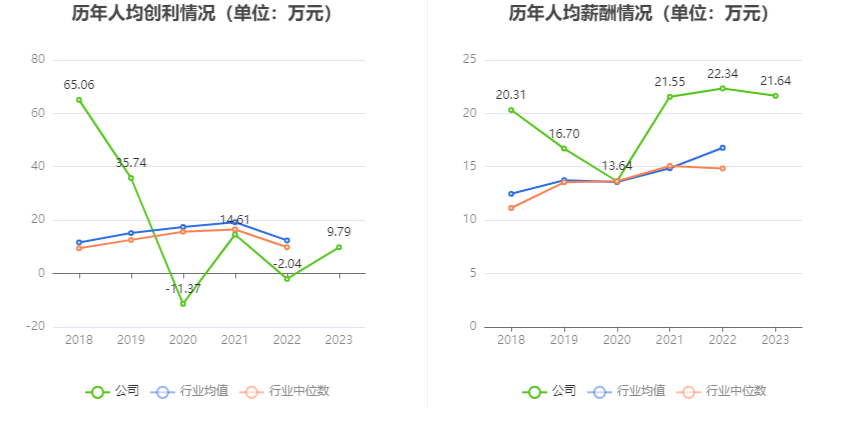 截至2023年末,公司员工总数为1149人,人均创收83.23万元,人均创利9.79万元,人均薪酬21.64万元,较上年同期分别变化-25.41%、580.92%、-3.16%。