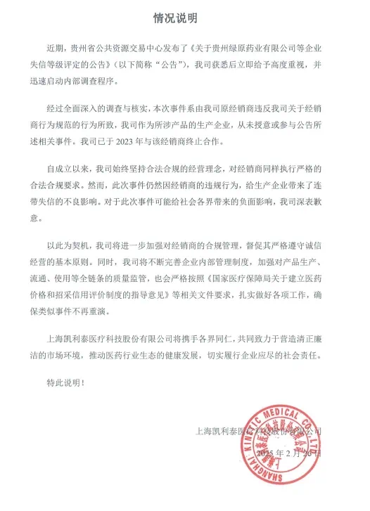 近日,贵州省公共资源交易中心发布《关于贵州绿原药业有限公司等企业失信等级评定的公告》,上海凯利泰医疗科技股份有限公司(以下简称“凯利泰”)被列为连带失信企业,引发社会广泛关注。对此,凯利泰迅速作出回应。