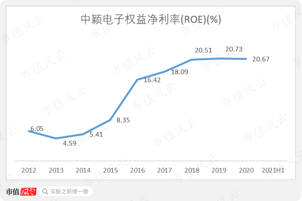 上市以来,中颖电子的ROE由6.05%上升至20.67%,提高了13个百分点,目前,ROE保持在20%左右。