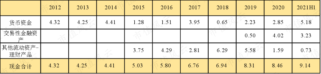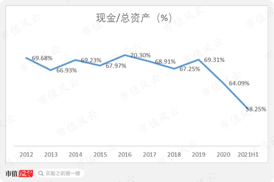 截至2021年6月底,公司账面现金占总资产的58.25%,虽然占比有所下降,但仍有一半是白花花的银子。