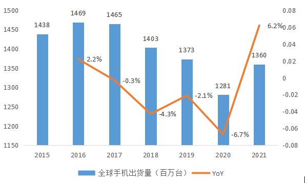 手机经过了近三十年的发展,尺寸逐渐缩小,而屏幕逐渐增大,在短视频和手游等大屏应用大行其道的时代,当二者达到某一瓶颈期时,折叠屏手机应运而生。受消费者平均换机周期延长影响,叠加因20年后疫情影响而出现的供应商组件短缺,根据IDC数据,全球智能手机出货量自2017年下滑,仅2021年略有回暖,全球智能手机出货量为13.6亿台,同比增长6.2%。
