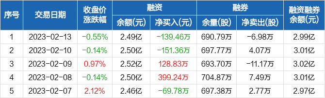 宜安科技融资融券信息显示,2023年2月13日融资净偿还139.46万元;融资余额2.49亿元,较前一日下降0.56%。