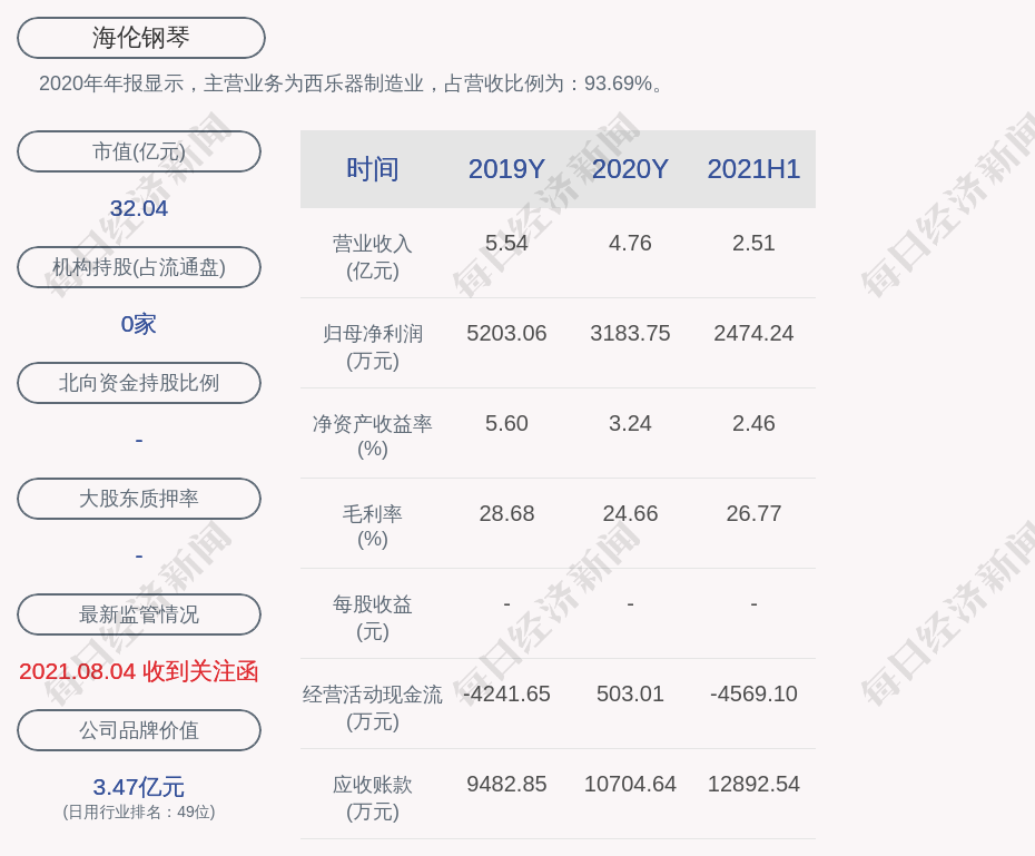 2020年年报显示,海伦钢琴的主营业务为西乐器制造业,占营收比例为:93.69%。