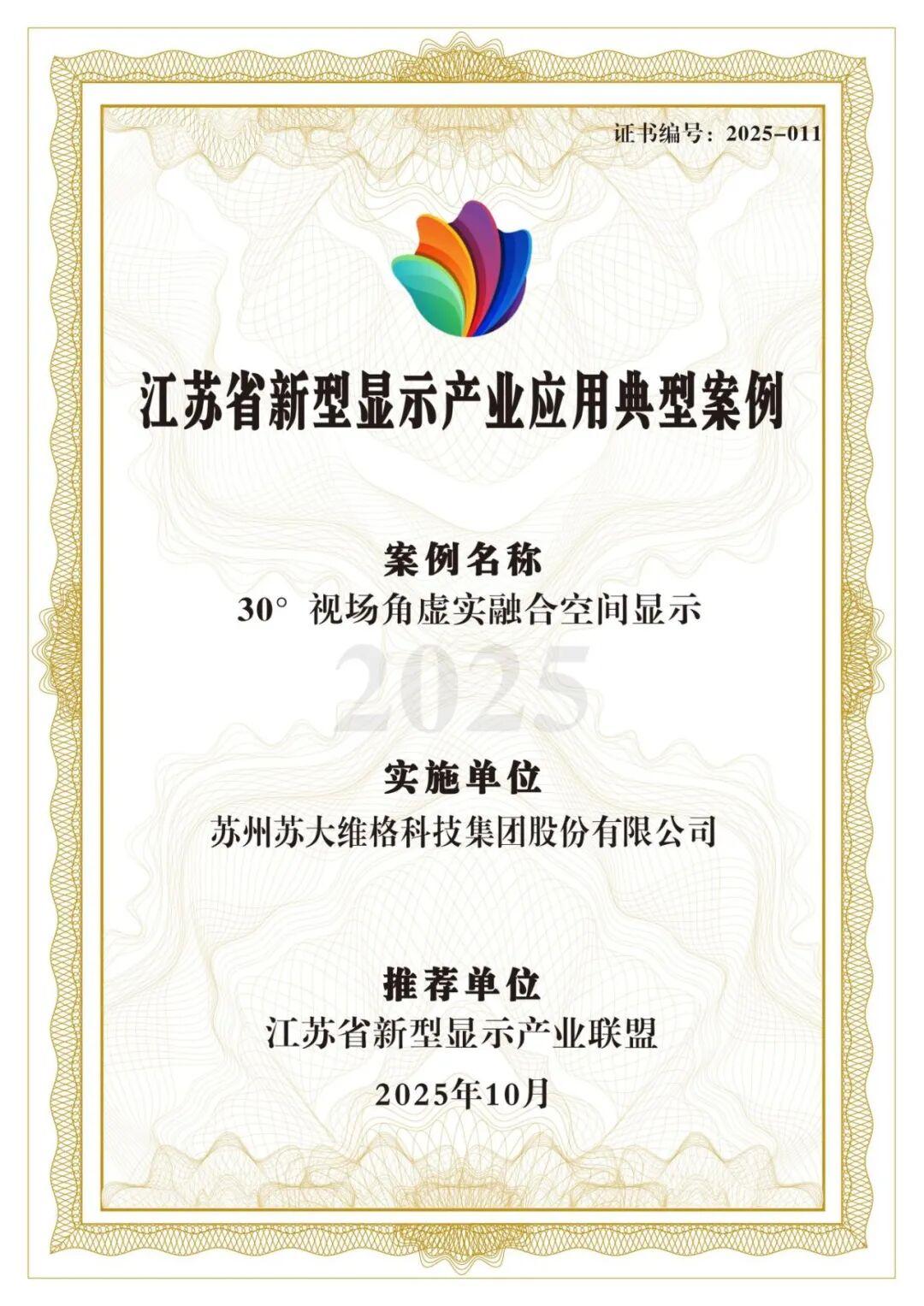 苏大维格自主研发生产的30°视场角虚实融合空间显示,凭借在文化旅游产业的创新应用,入选“2025年度江苏省新型显示产业应用典型案例”。