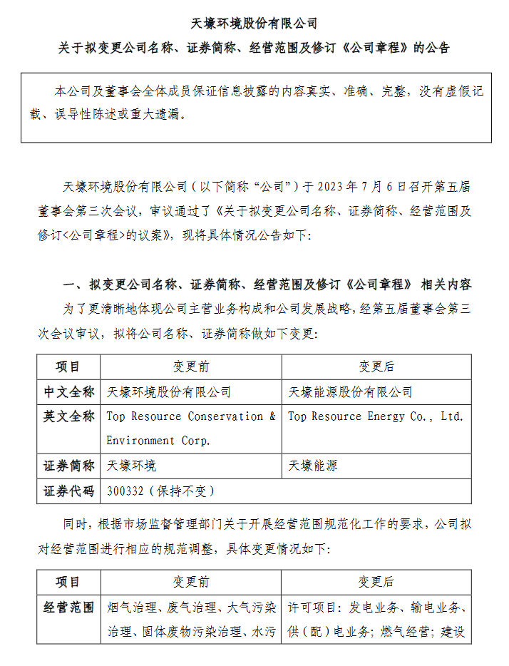 天壕环境公布,公司于2023年7月6日召开第五届董事会第三次会议,审议通过了《关于拟变更公司名称、证券简称、经营范围及修订的议案》。