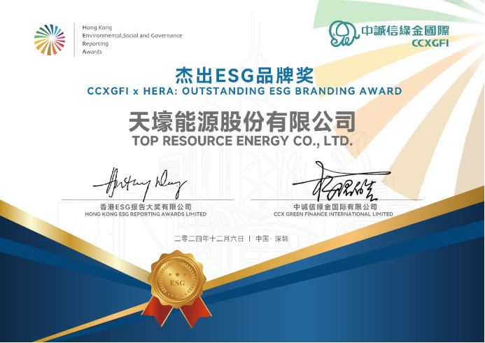 12月6日, 2024粤港澳大湾区可持续发展论坛暨香港ESG报告大奖(HERA)颁奖典礼在深圳举行,天壕能源凭借在可持续发展方面的卓越表现,荣获2024年度“CCXGFI×HERA:杰出ESG品牌奖”。