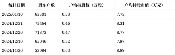 从1月14日公开信息显示,兆日科技截至2025年1月10日公司股东户数为6.35万户,较上期(2024年12月31日)减少9963户,降幅为13.56%,持股趋于集中。