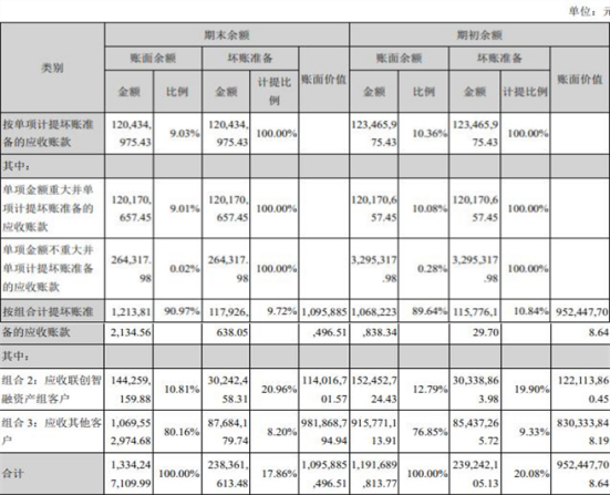 截至2021年12月31日,润和软件去年应收账款期末账面余额合计为13.34亿亿元,坏账准备期末余额合计为2.38亿元,应收账款净值10.96亿元,计提比例为17.86%,应收账款净值占合并资产总额24.83%。