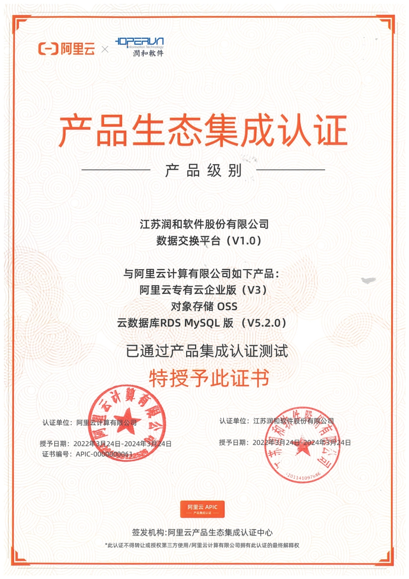 近日,江苏润和软件股份有限公司(以下简称“润和软件”)的数据交换平台(V1.0)与阿里云计算有限公司(以下简称“阿里云”)的云数据库RDS MySQL版、阿里云专有云企业版等产品经过严格测试程序完成认证测试,获得产品生态集成认证证书。双方联合打造金融数字化解决方案,助力银行业、金融业数字化转型。