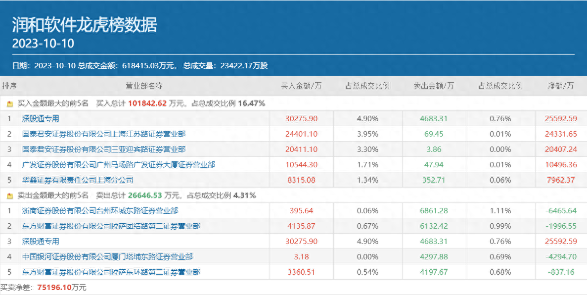 盘后披露的龙虎榜数据显示,润和软件买方前五位合计的买入金额高达10.18亿元,占该股当日总成交额的比例达16.47%。其中,深股通专用席位以高达3.03亿元的买入额高居买方榜首,该席位同时也卖出该股0.47亿元。