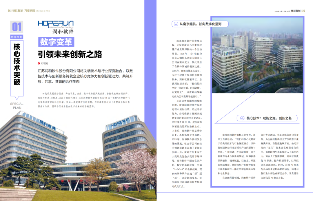 时代的发展浩浩荡荡,奔流不息。当前,数字化转型风起云涌,智能化浪潮汹涌澎湃,站在大变革、大发展、大融合的时代潮头,江苏润和软件股份有限公司(以下简称“润和软件”),这家源自南京的科技巨擘,犹如一艘破浪前行的旗舰,以尖端软件技术(数智技术和创新服务)为帆,引领各行各业驶向数字化未来的浩瀚蓝海。