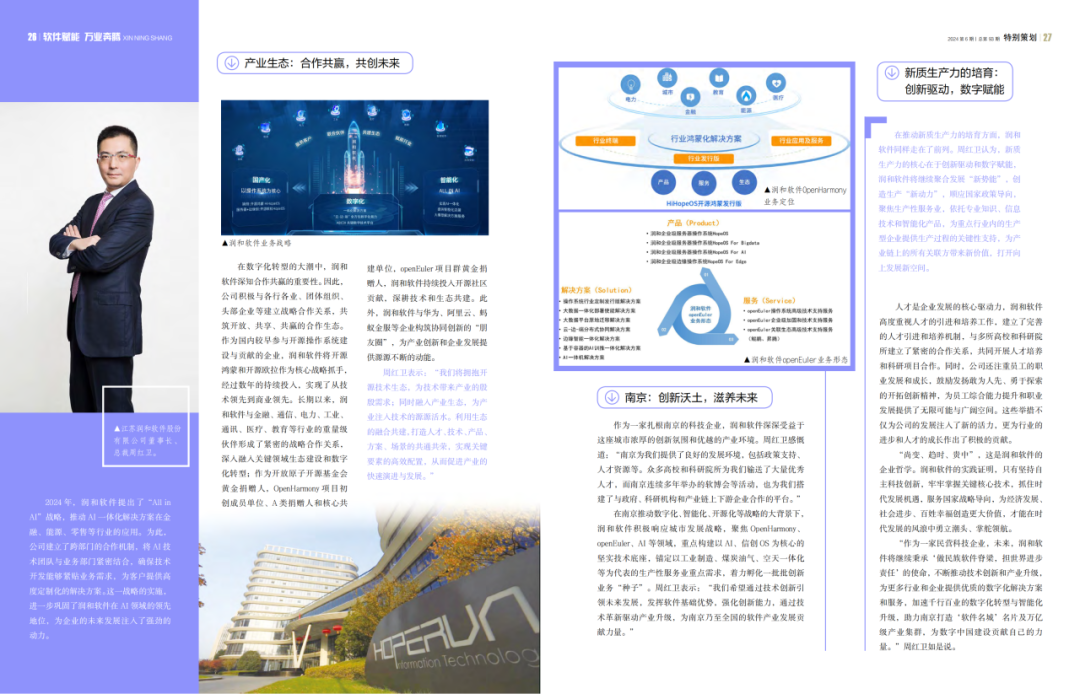 在南京推动数字化、智能化、开源化等战略的大背景下,润和软件积极响应城市发展战略,聚焦OpenHarmony、openEuler、AI等领域,重点构建以AI、信创OS为核心的坚实技术底座,锚定以工业制造、煤炭油气、空天一体化等为代表的生产性服务业重点需求,着力孵化一批批创新业务“种子”。周红卫表示:“我们希望通过技术创新引领未来发展,发挥软件基础优势,强化创新能力,通过技术革新驱动产业升级,为南京乃至全国的软件产业发展贡献力量。”