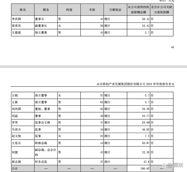 年报显示,报告期内公司实际支付董事、监事、高级管理人员报酬共360.65万元,董事长李洪国2021年从公司获得报酬为36.42万元,副董事长邵秀英2021年从公司获得报酬为32.42万元,董秘、董事刘凤国2021年在本公司领取薪酬为30.38万元。