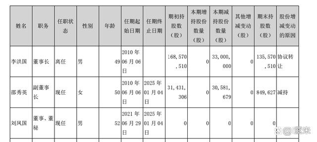 现任董事长李洪鹏报告期末持股数为1,929,507。原董事长李洪国2022年01月04日任期满离任,报告期内协议转让减持股份33,000,000,报告期末持股数为135,570,510。