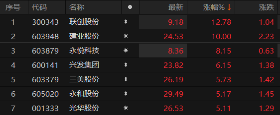7月12日午后,申万一级行业板块中,基础化工板块震荡上行。截至13时59分,联创股份涨逾12%,永悦科技涨超8%,兴发集团涨逾6%,建业股份此前涨停。