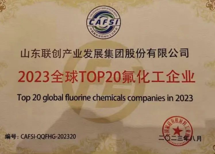 经氟硅协会评选,联创股份成功入选并获得2023 中国氟化工上市公司 TOP10、全球氟化工TOP20的殊荣!