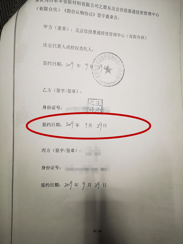 投资者提供的《股权认购协议书》显示,此次认购方式为投资者以现金方式认购北京信投持有的华安新材股权,按照定向增资10%华安新材股权价值5亿元计算,即50万元持有北京信投0.1%的股权。