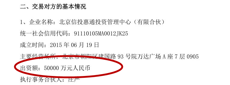 而“回购”公告中标明北京信投的“出资额”为5亿元,尽管这5亿元是否是实缴出资尚不明确,但较8888万元的投资款来说相差甚远。