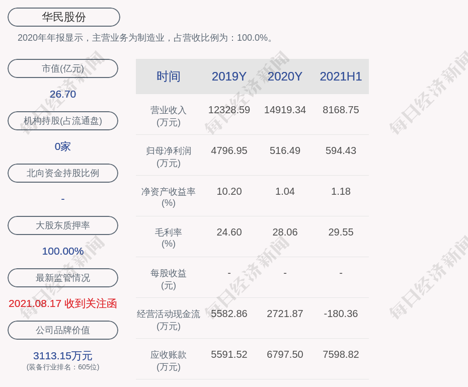 2020年年报显示,华民股份的主营业务为制造业,占营收比例为:100.0%。