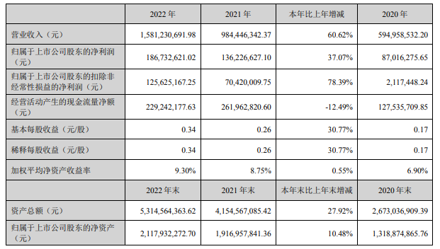 近日,半导体材料领域-江苏南大光电材料股份有限公司(简称:南大光电)披露了2022年年度业绩公告。公告显示,2022全年,南大光电累计实现营收15.81亿元,较去年同期同比增长60.62%,实现归母净利润1.87亿元,较去年同期同比增长37.07%。