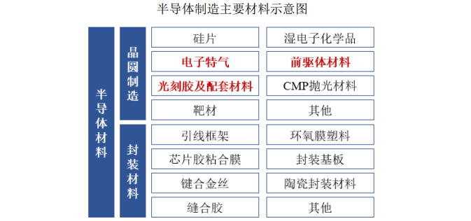 值得一提的是,先进前驱体材料、电子特气、光刻胶及配套材料系半导体晶圆制造生产过程中所必需的材料,合计占晶圆制造所需材料比重超过 1/4。
