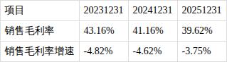 ?销售毛利率持续下降。近三期年报,销售毛利率分别为43.16%、41.16%、39.62%,变动趋势持续下降。