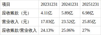 ?应收账款/营业收入比值持续增长。近三期年报,应收账款/营业收入比值分别为24.13%、25.06%、27%,持续增长。