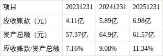 ?应收账款/资产总额占比持续增长。近三期年报,应收账款/资产总额比值分别为7.16%、9.08%、11.34%,持续增长。
