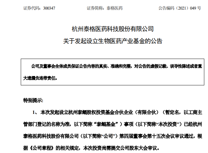 泰格医药表示,本次投资的目的是为了抓住生物医药领域发展的机遇,依托基金管理人的行业经验、管理优势,以及其他投资方的资金及资源等优势,拓展投资渠道,进一步深化公司在生物医药领域的布局,推动公司上下游产业链的优化升级,提升公司的核心竞争力和抗风险能力,推动公司不断持续发展壮大,为未来持续健康发展提供保障。