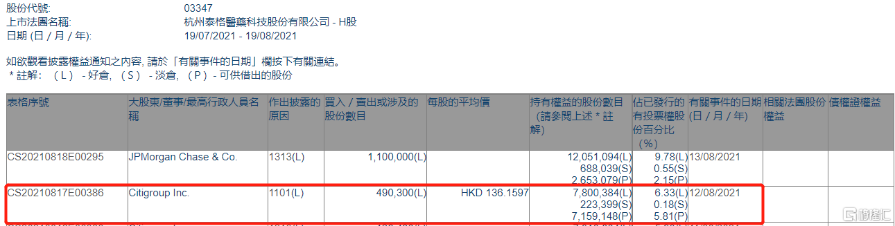 格隆汇APP获悉,根据联交所最新权益披露资料显示,2021年8月12日,泰格医药(03347.HK)获Citigroup Inc.在场内以每股均价136.1597港元增持好仓49.03万股,涉资约6675.91万港元。