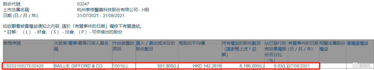 格隆汇APP获悉,根据联交所最新权益披露资料显示,2021年8月27日,泰格医药(03347.HK)获BAILLIE GIFFORD & CO在场内以每股均价142.2816港元增持50.18万股,涉资约7139.7万港元。