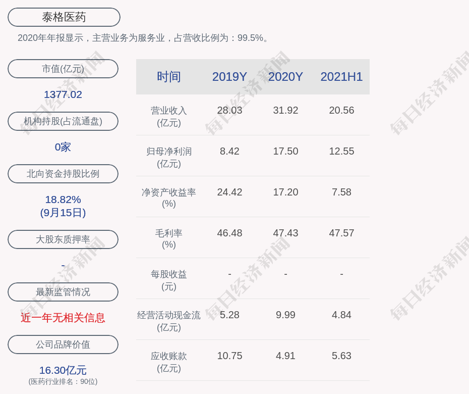 2020年年报显示,泰格医药的主营业务为服务业,占营收比例为:99.5%。