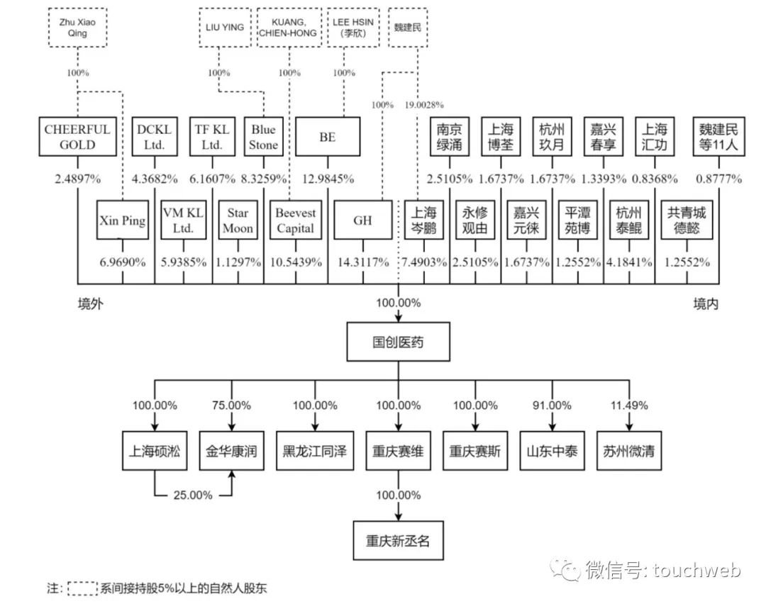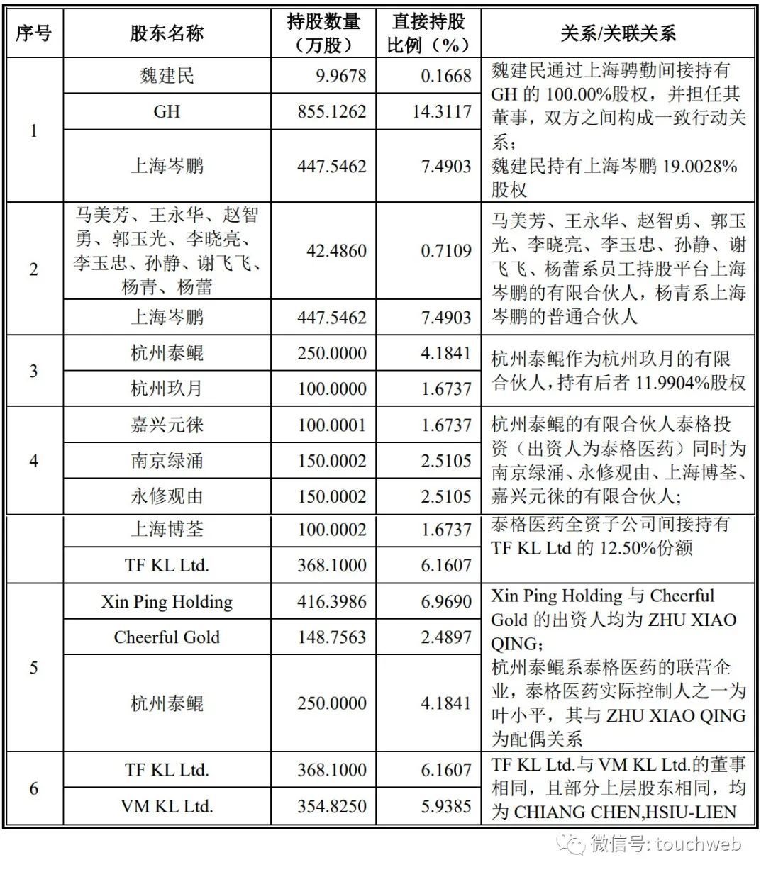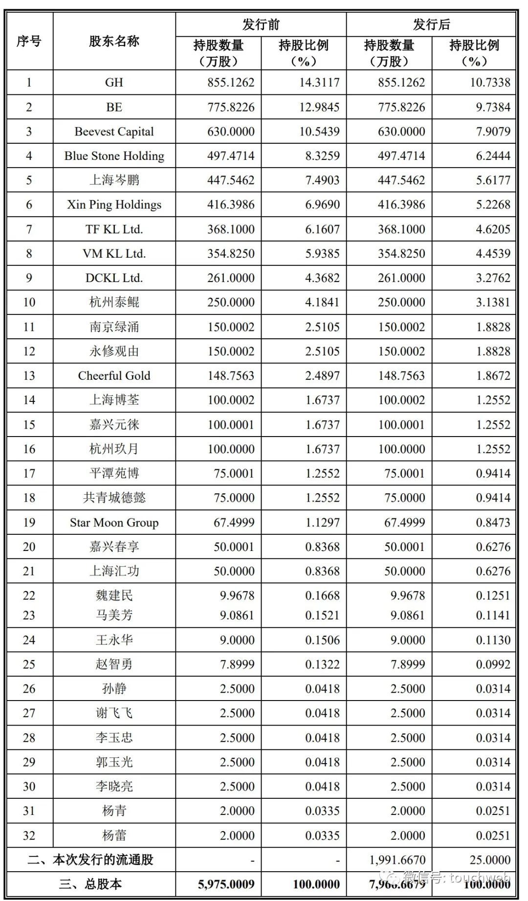 IPO前,GH持股为14.3117%,BE持股12.9845%,Beevest Capital持股10.5439%,Blue Stone Holding持股8.3259%,上海岑鹏持股7.4903%,Xin Ping Holdings持股为6.969%;TF KL Ltd.持股为6.1607%,VM KL Ltd.持股5.9385%,DCKL Ltd持股4.3682%,杭州泰鲲持股4.1841%。