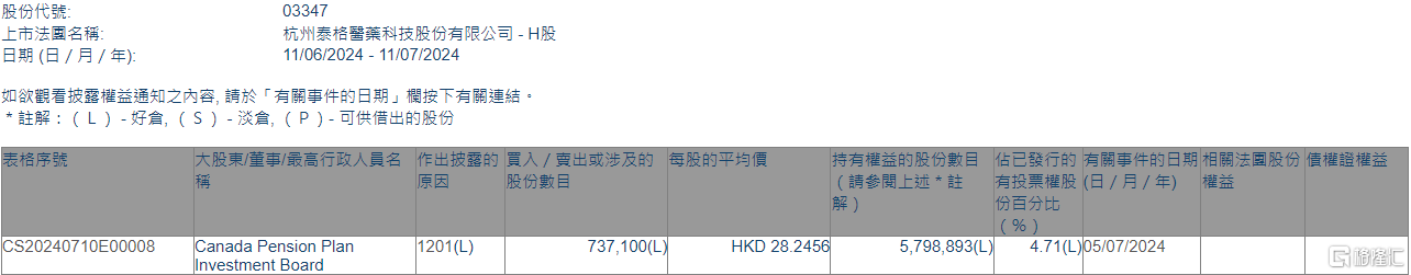 格隆汇7月11日丨根据联交所最新权益披露资料显示,2024年7月5日,泰格医药(03347.HK)遭Canada Pension Plan Investment Board在场内以每股均价28.2456港元减持73.71万股,涉资约2082万港元。