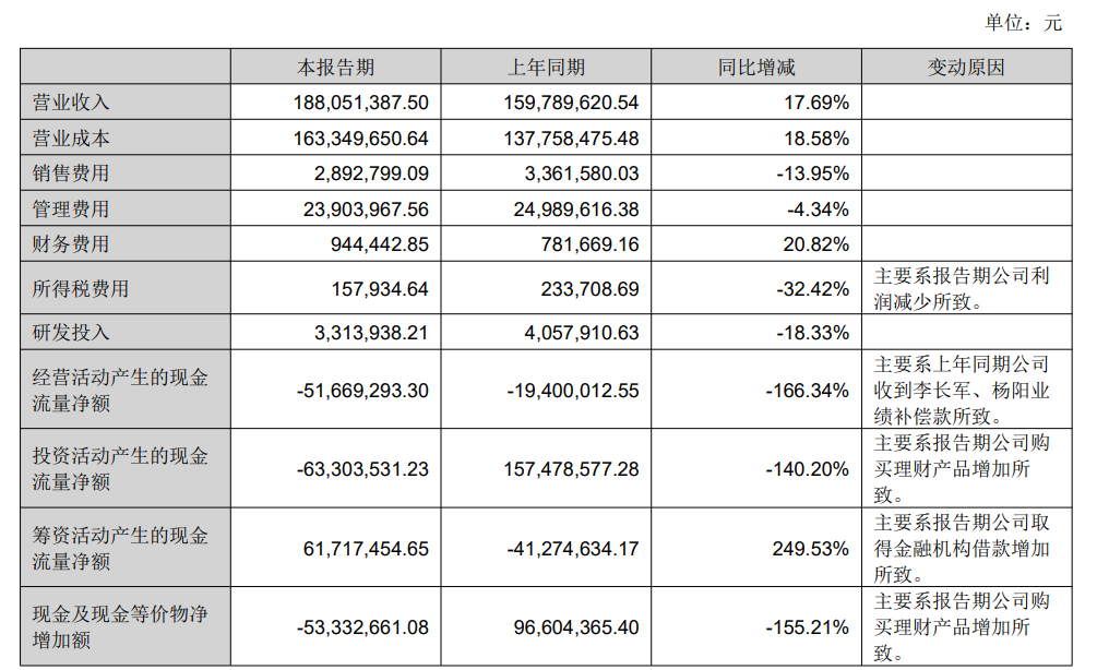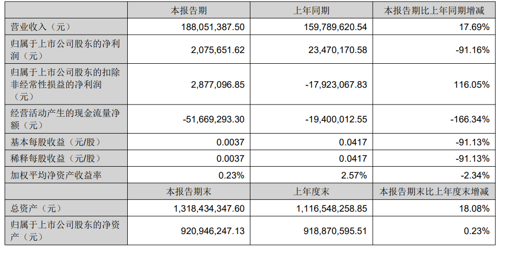 8月26日,华鹏飞(300350.SZ)发布上半年财报,数据显示,上半年营业收入1.88亿元,同比增长17.69%,净利润207.57万元,同比下降91.16%,基本每股收益为0.00元。期末资产总计为13.18亿元,应收账款为4.25亿元;现金流量方面,经营活动产生的现金流量净额为-5166.93万元,销售商品、提供劳务收到的现金为1.65亿元。