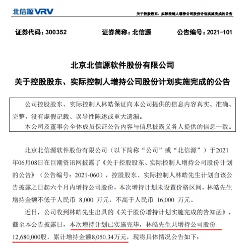 11月5日,北信源(300352.SZ)发布公告称,北信源控股股东、实际控制人林皓已完成增持计划,6月至11月,林皓通过集中竞价交易共增持公司股份 1268万股,累计增持金额8,050.34万元。本次增持计划完成后,林皓持股数量占总股本比例为21.68%。