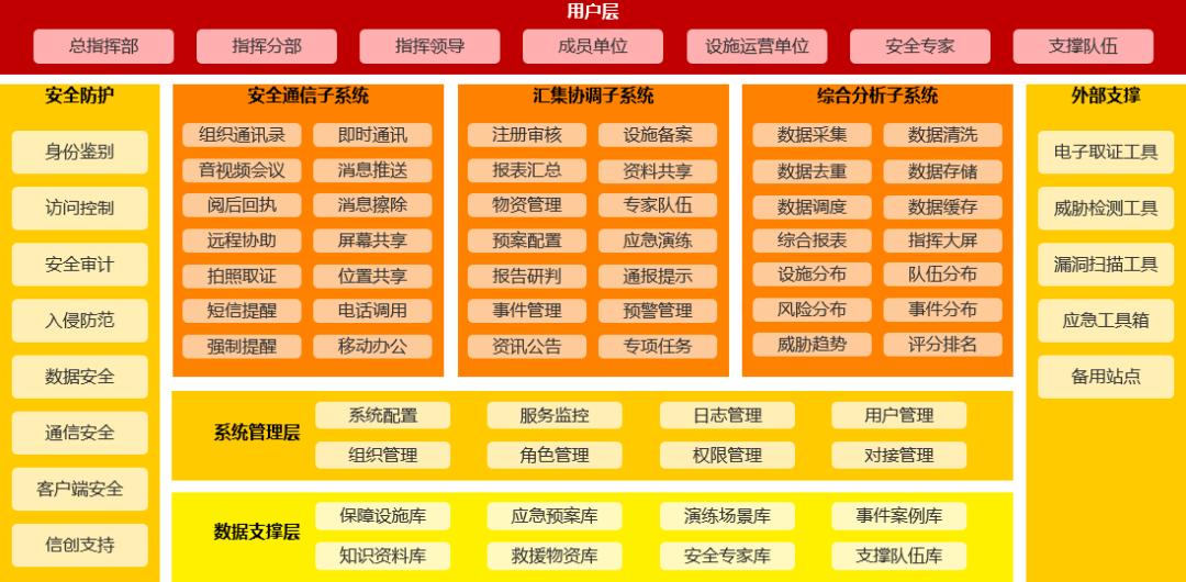 为了预防网络安全突发事件,加大事件处置速度与响应能力,国家电投开展了“长城行动”网络安全应急指挥系统的建设。北信源深掘国电投在网络安全及关键信息基础设施保障体系建设过程中的问题,建设了国电投应急指挥平台系统,平台由安全通信子系统、汇集协调子系统、综合分析子系统三个子系统组成: