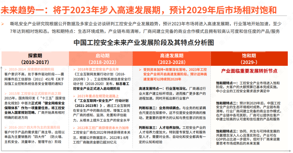 IDC最新发布的《全球OT安全预测,2022-2026》报告显示,到2026年,全球工控安全市场规模将达到67.6亿美元,年复合增长率将达到28.4%。根据嘶吼安全产业研究院的公开数据显示,工控安全产业2023年将步入高速发展期,到2029年市场相对饱和,生态环境逐渐成熟,产业链布局清晰,厂商间建立完备的商业合作模式且拥有较高认可度和信任度的产品或服务。