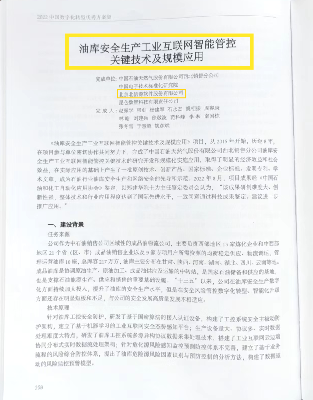 以ASN为核心的工控安全方案《油库安全生产工业互联网智能化管控关键技术及规模应用》成果针对油库工控安全技术防护能力不足、生产设备量大协议多、实时数据处理难度大等技术难题,建立了油气储运行业工控安全防护体系架构,搭建了行业内工业互联网云边端协同分布式实时数据流处理架构,建立了基于业务流程的风险综合防控体系。该成果于去年通过了“中国石油和化工自动化应用协会”的鉴定评审,鉴定委员会给予项目技术和应用效果高度评价,认为“该成果研制难度大、创新性强,整体技术和行业应用程度达到了国际先进水平,建议进一步推广应用。”
